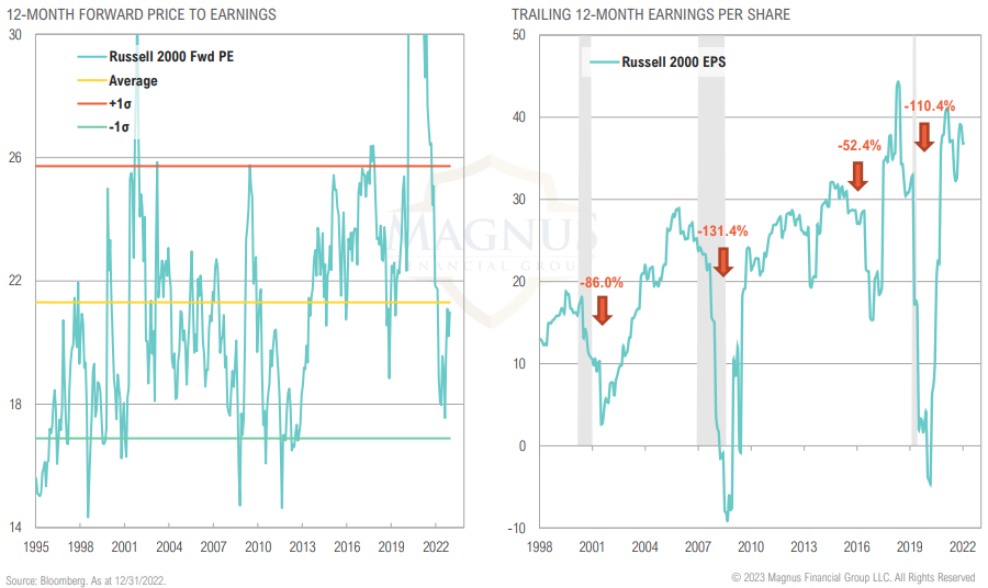 U.S. small cap forward valuations have improved due to bear market, slightly below average relative to history; focus now shifts to earnings decline