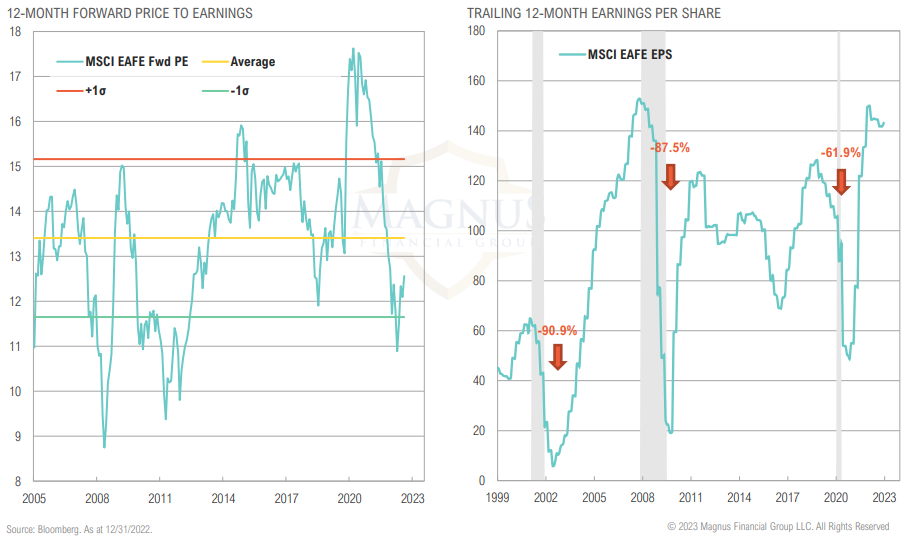 DM forward valuations have improved due to bear market, well below average relative to history; focus now shifts to earnings decline