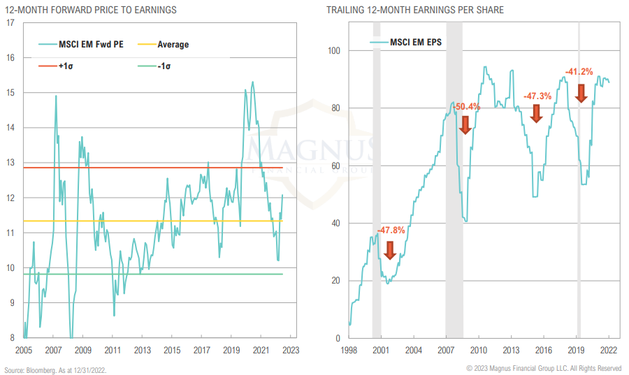 EM forward valuations have improved due to bear market, but back above average relative to history; focus now shifts to earnings decline