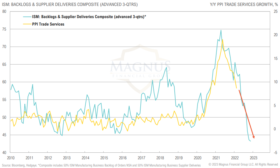 Supply chain pressures (proxied by backlogs and delivery times) have led to higher margins (proxied by PPI Trade Services); margins look set to decrease in coming years
