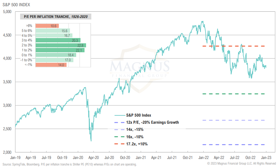 What if inflation doesn’t roll and stay lower? How low can we go? P/Es to consider are 16x, 14x, and 12x, applied to various levels of earnings decline