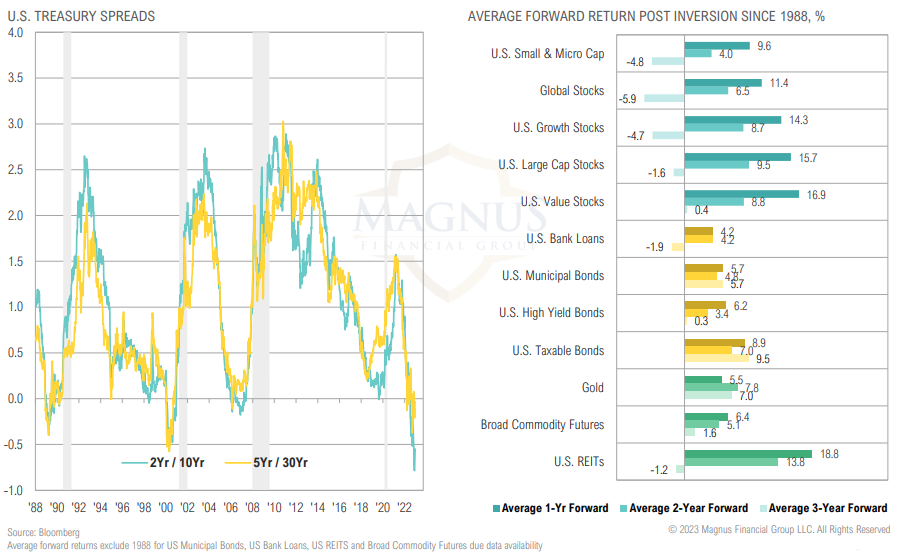 Yield curve inversion signaling slowing growth; risky assets can generate strong short-term returns post inversion, but we don’t like “pennies in front of steam roller” trades