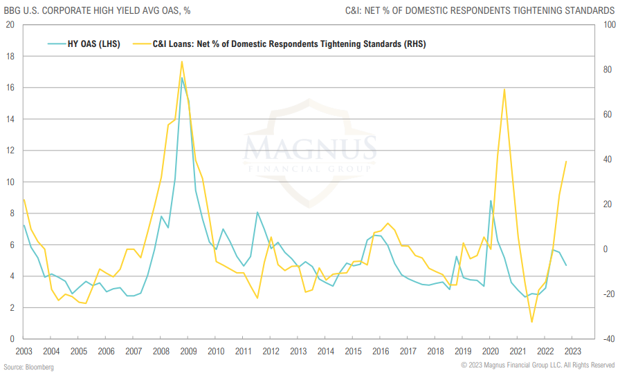 Domestic banks have tightened lending standards sharply over recent months, an event which has generally been associated with wider credit spreads
