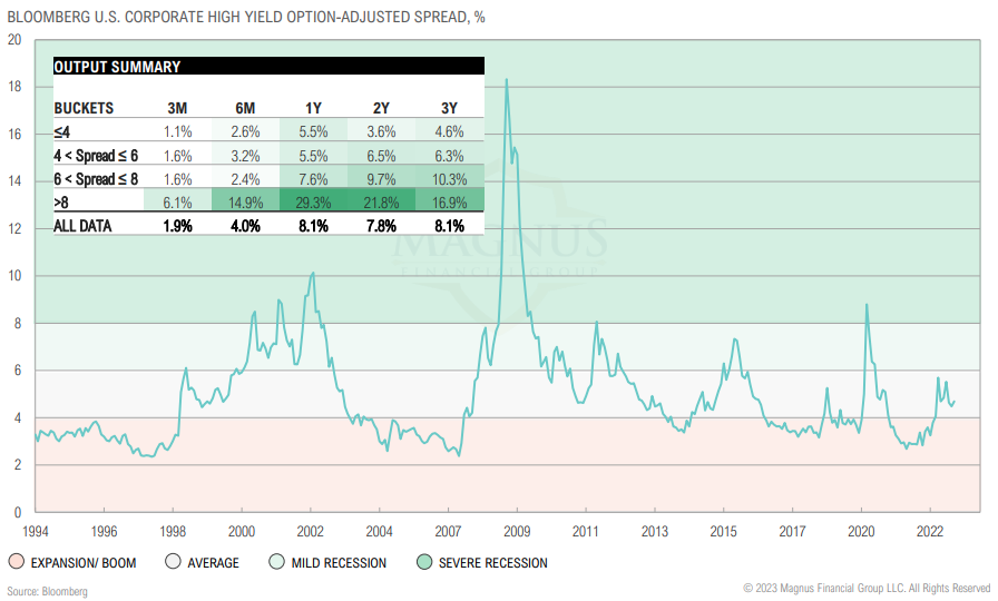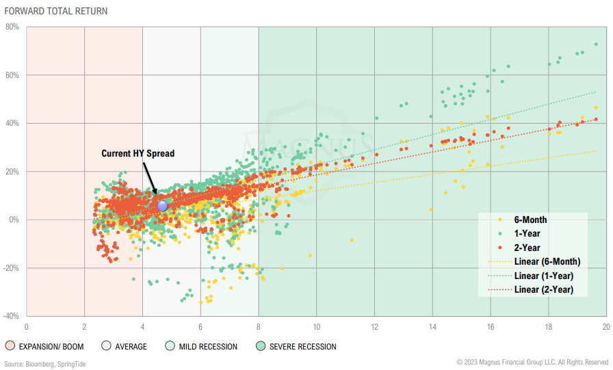 Historically, high yield spreads above 6% have resulted in above-average forward returns; high yield spread currently trading at a middling 4.7%