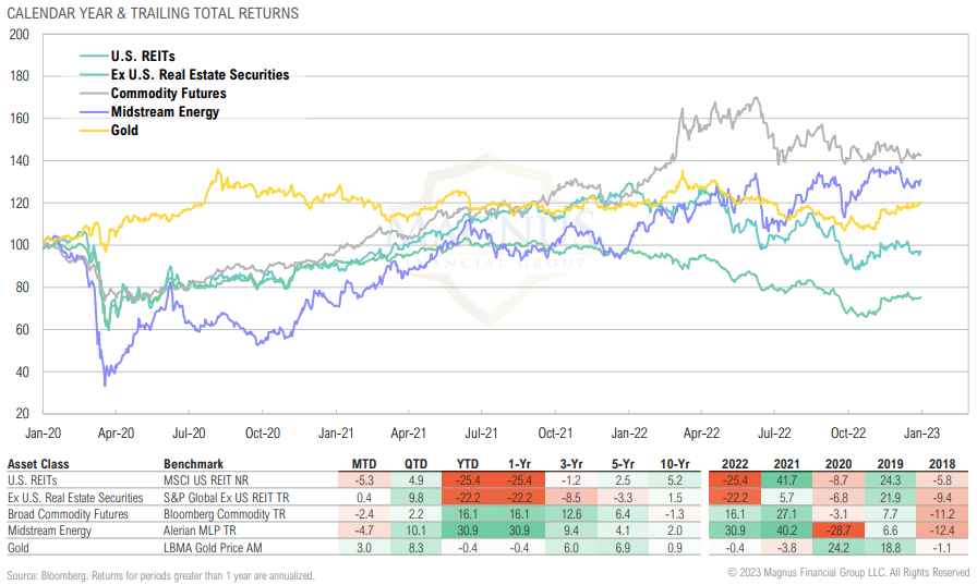 Broad commodity futures and midstream energy were among the top performing real assets over 2022, while both U.S. and global REITs ended the year in bear market territory