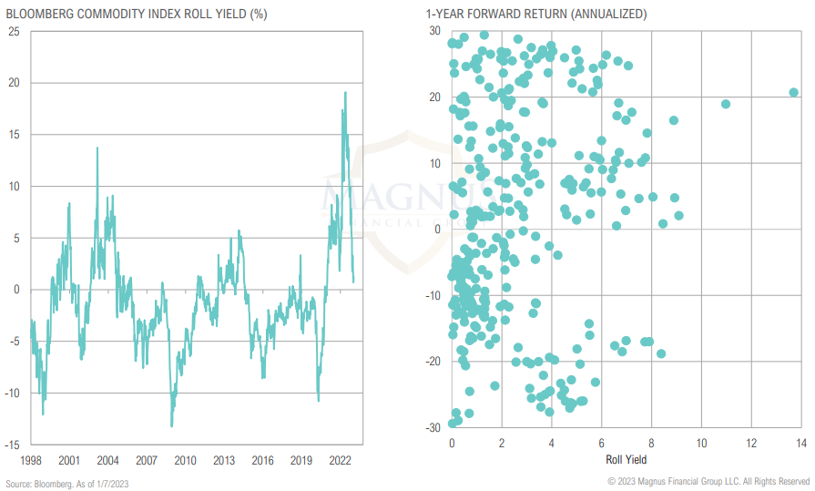 Commodity roll yields have dropped sharply, largely due to natural gas futures shifting back to contango, suggesting global commodity markets have loosened