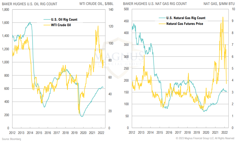Oil and natural gas producers have slowed increases in rig counts as prices have rolled over