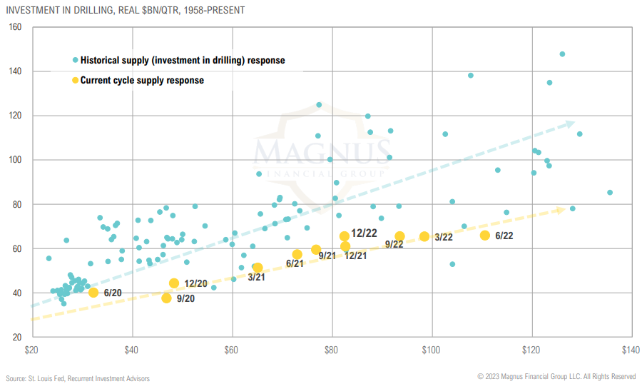 Since COVID, drilling capex levels have been near the bottom of a 65-year range