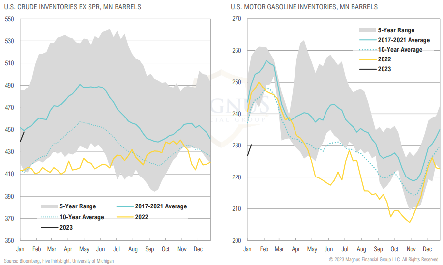 Crude inventories have built to start the year while gasoline inventories remain tight relative to the past five years