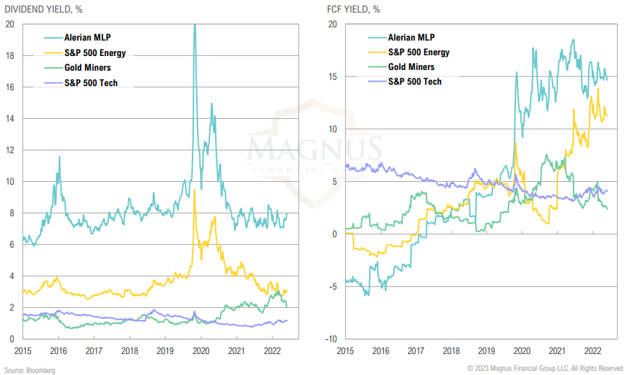 Positive-carry policy hedge – midstream energy, gold miners and commodity futures now have positive carry and may provide a hedge if the Fed pivots early. Conversely, these hedges may underperform in a severe recession.