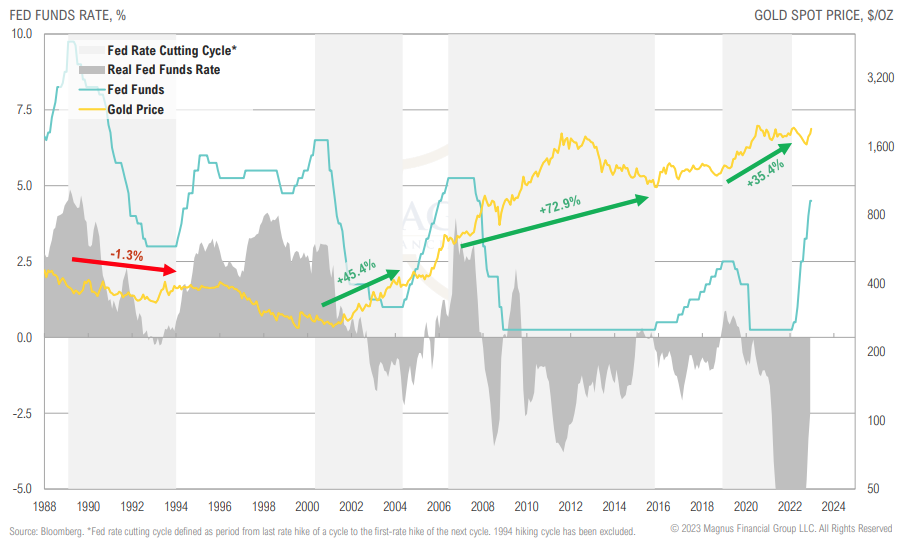 Since the turn of the century, the end of hiking cycles have been positive for gold; this may be due to lower opportunity costs (falling real rates)