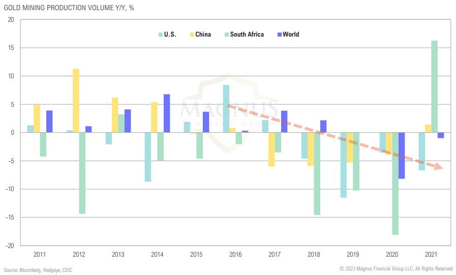 Global gold production volumes have been tracking lower in recent years