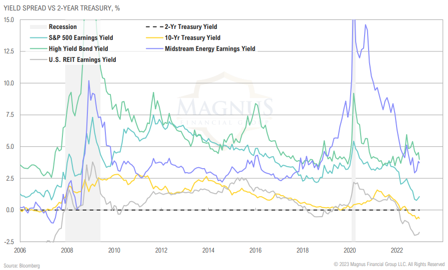 Most asset classes don’t look attractive relative to the 2-year Treasury yield; spreads have some way to go if past recessions are at all indicative