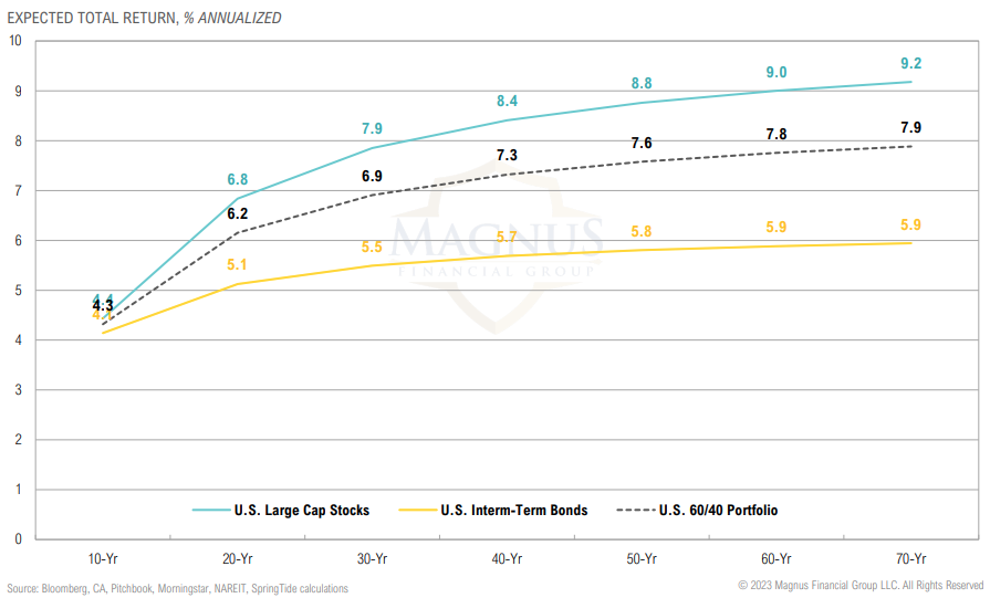 Fixed income returns continue to offer similar returns to U.S. large cap stocks over 10 years (pre-inflation, which is big unknown)