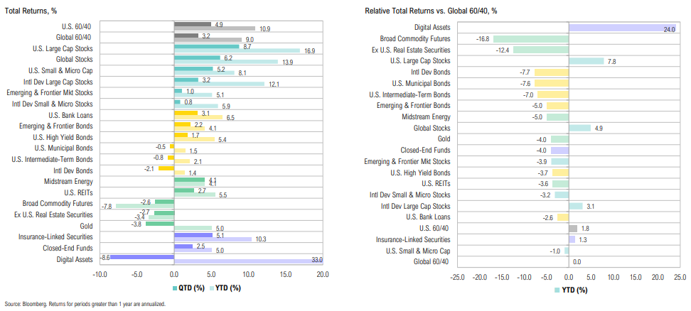 Major winners over the quarter included U.S. large and small cap stocks, while gold, ex-U.S. real estate and broad commodity futures lagged