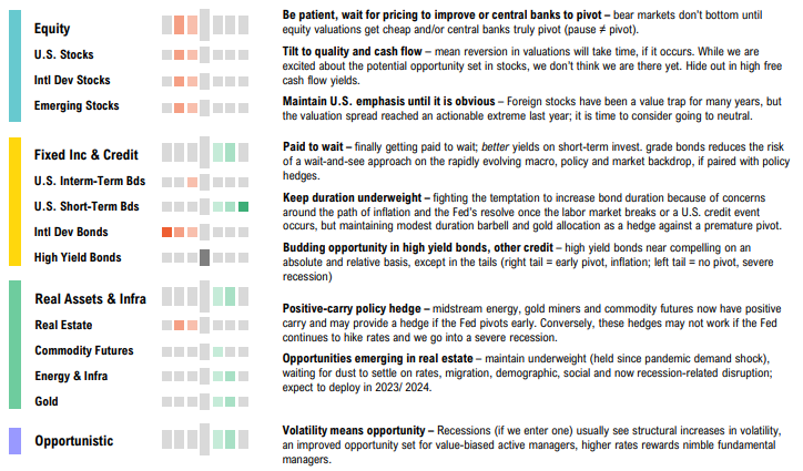 Opportunities emerging in real estate – maintain underweight (held since pandemic demand shock), waiting for dust to settle on higher rates, migration, demographic, social, and now recession-related disruption; expect to deploy in late 2023/early 2024.