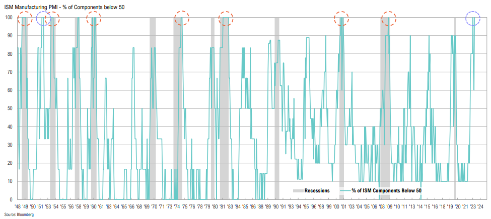 Every ISM Manufacturing PMI component registered below 50 in June: the only other time this happened and the U.S. was not in a recession was in 1952