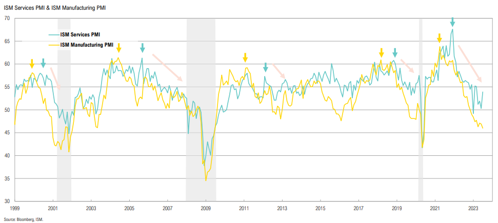 However, ISM Services tends to lag Manufacturing, particularly into slowdowns