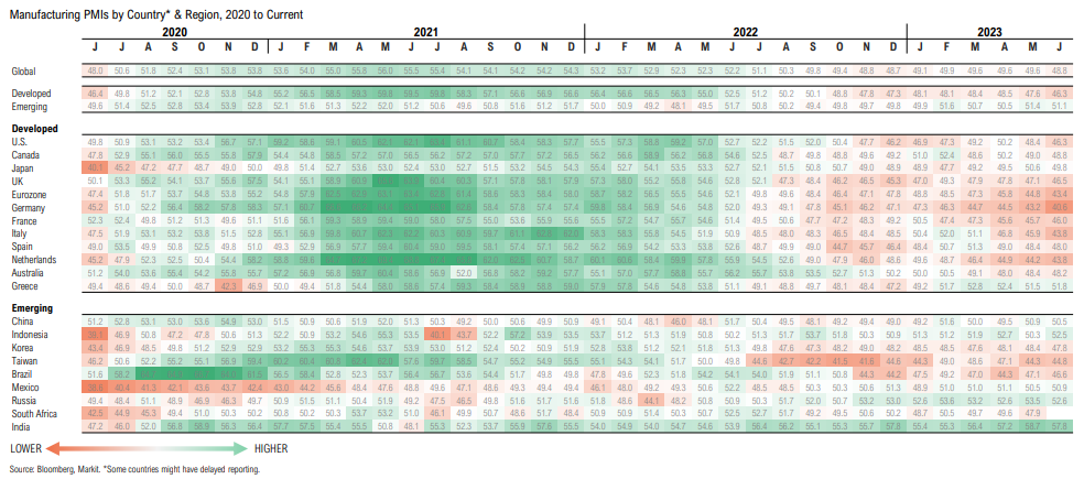 Overall, global manufacturing activity continued deeper into contractionary territory in June; developed market activity continued to slow while EM has been recovering modestly