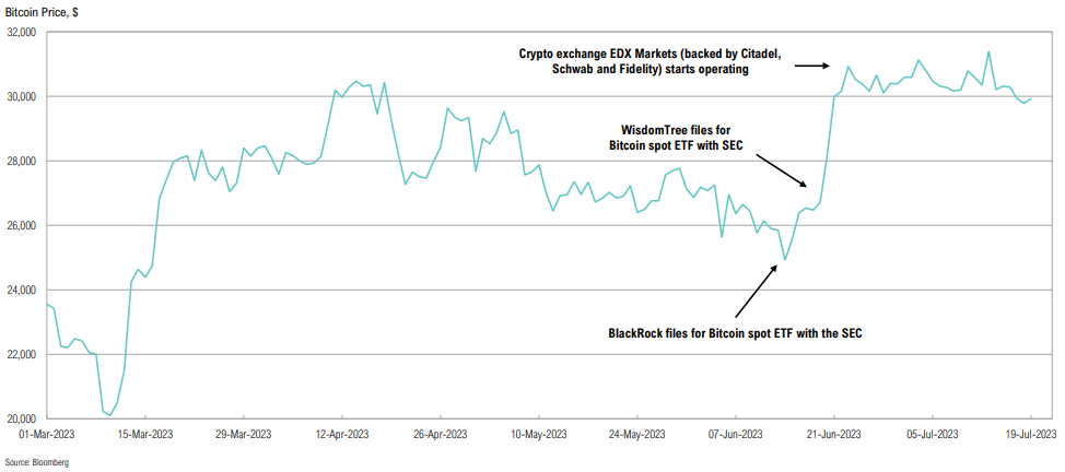 It’s been busy in the crypto-verse: BLK filed an application for a Bitcoin spot ETF with the SEC, and a new crypto exchange launched; Bitcoin is up 19% since BLK filing