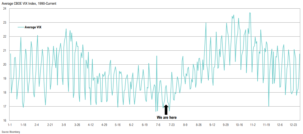 On average, the VIX tends to bottom around this time of the year, with the back half of July generally being the low point and volatility increasing into the fall
