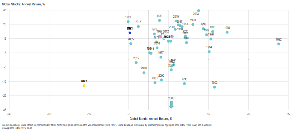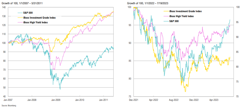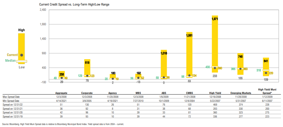 Budding opportunity in high yield bonds, other credit – High-yield bonds got close to a compelling level on an absolute and relative basis last year, except in the tails (right tail = early pivot, inflation; left tail = no pivot, severe recession).