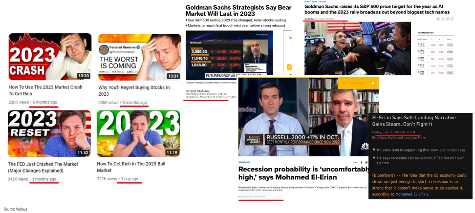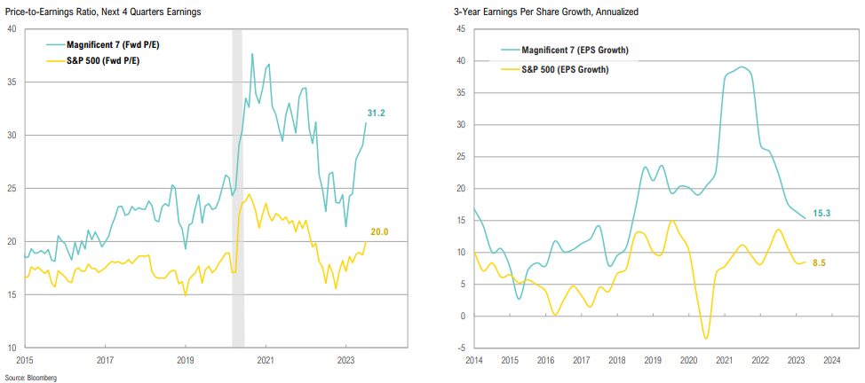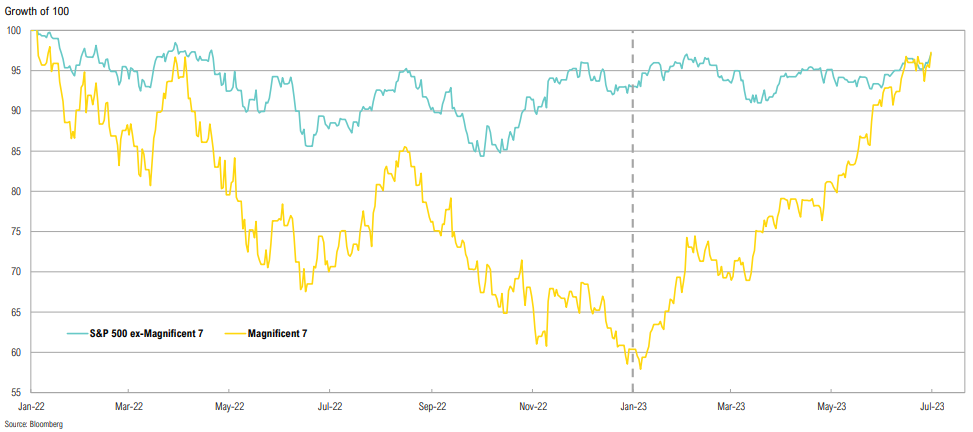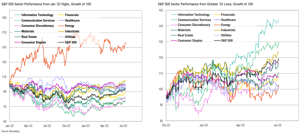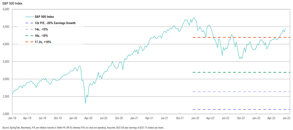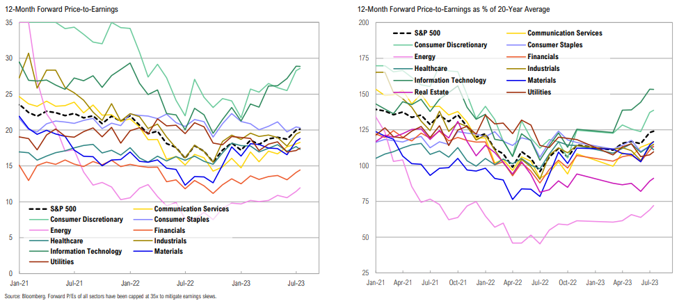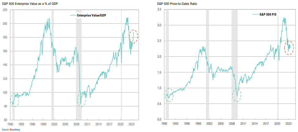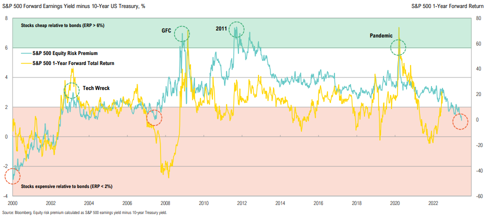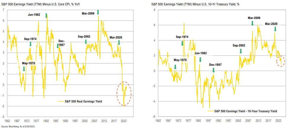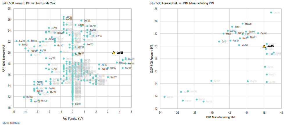 Stay patient and careful – Aggressive hiking cycles almost always cause recessions; the stock market has never bottomed ahead of official start of recession & recession is unlikely to start until labor market cracks; further, markets don’t usually bottom until equity valuations get cheap and/or central banks pivot (pause ≠ pivot);. This time may be different because of consumer balance sheets, AI, or something else, but the macro backdrop is challenging enough and equity valuations high enough to err on the side of caution, in our view.