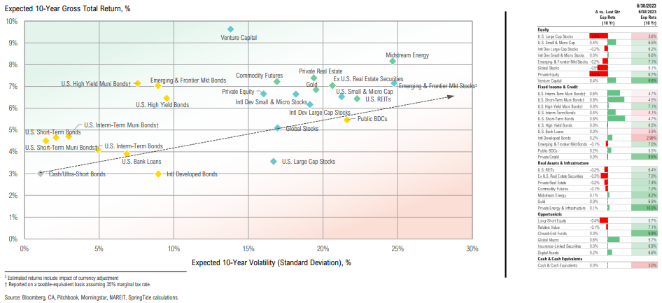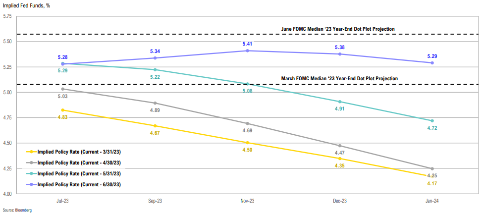 Year-end Fed Funds projections shifted higher over the quarter due to strong economic data; markets are anticipating at least one more rate hike this year, with a cut only in early 2024