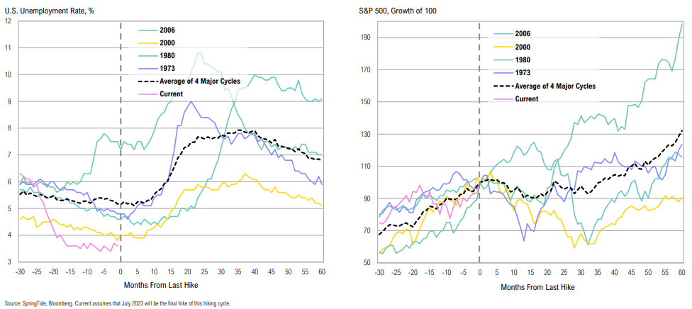 Previous extreme rate hiking cycles have only seen unemployment pick up long after the final hike; current unemployment is at the lowest of all prior rate hike cycles