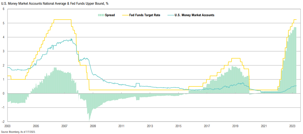 Big banks lend to the Fed at rates that dwarf what they pay on deposits, benefitting from higher interest rates; these extreme interest rate spreads contributed to the banking crisis instability that started in March