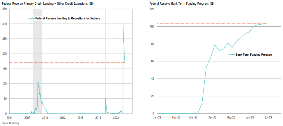 The usage of the Fed discount window (including other credit extensions) remains elevated; Bank Term Funding Program use is at new record levels as banks continue to rely on the Fed for liquidity