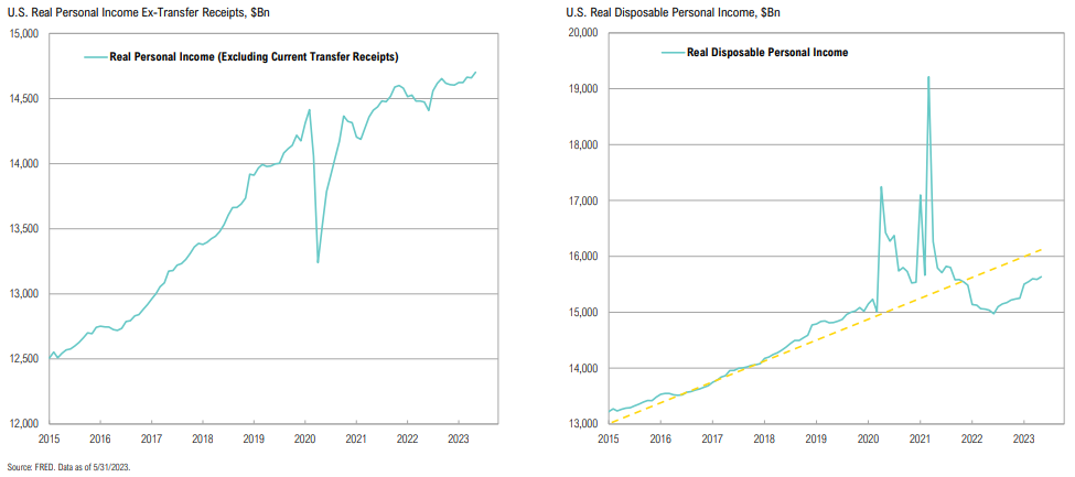 Real income, excluding government transfers, is still grinding higher; total disposable income remains well below average expected trends