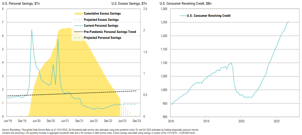 While still below the 5-year pre-COVID savings rate of 7.6%, personal savings rates have started to recover, now at 4.6%; if this savings rate continues, excess savings will be depleted by November ‘23