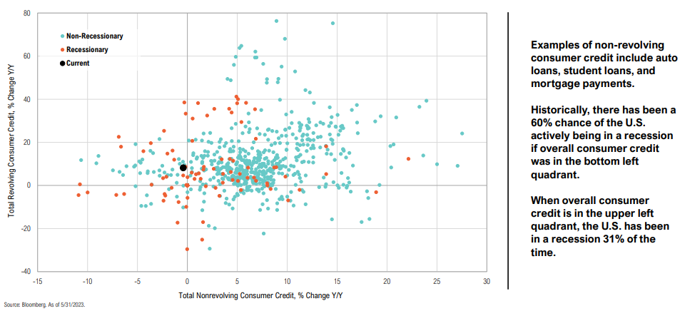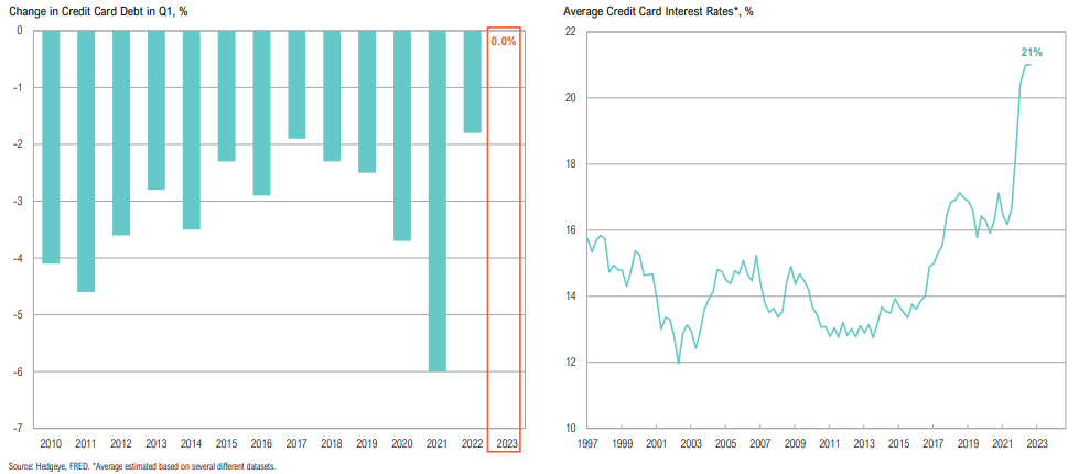 A portion of recent consumer spending has been sustained with credit: no credit card debt was paid down from Q4’22 to Q1’23; interest on credit cards is almost 21%