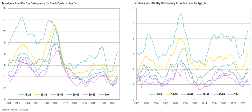 Credit card delinquencies have started to pick up amongst all age groups, but are most prominent between ages 18-40