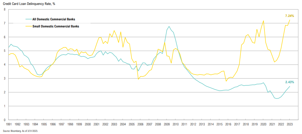 Credit card delinquency rates at small banks, who may be hit hardest by these rising delinquencies, are significantly higher than overall delinquency rates