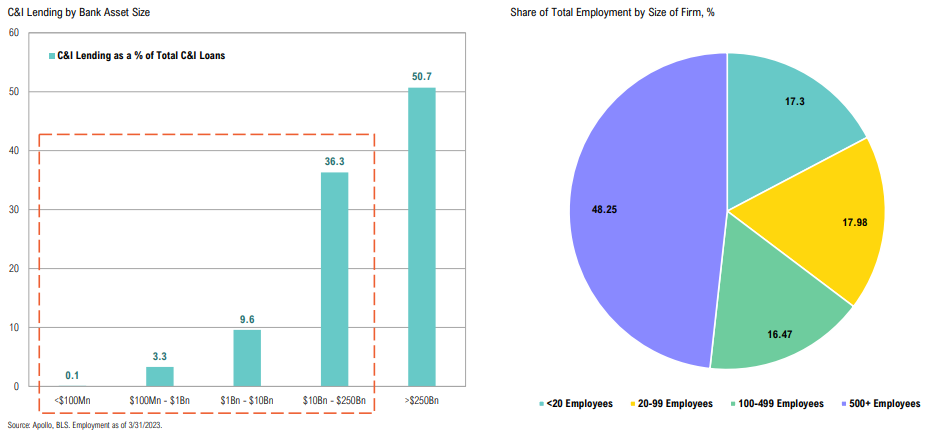 Smaller banks and smaller businesses matter! Almost half of C&I Loans are from banks with less than $250Bn in assets; more than half of U.S. employment is at firms with <500 employees