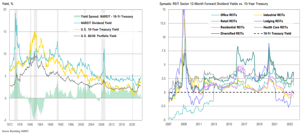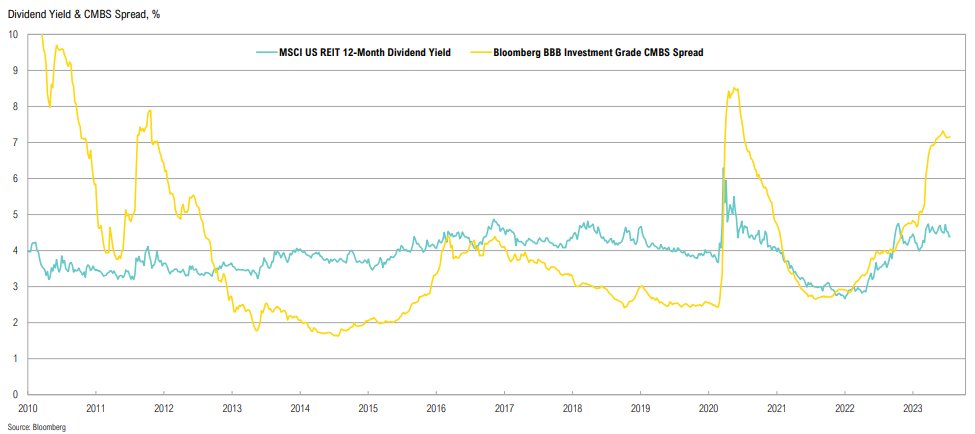 BBB rated investment grade CMBS securities are showing signs of stress, as spreads have widened to levels last seen in 2020; the sell-off in U.S. REITs has seen dividend yields expand to 4.5%