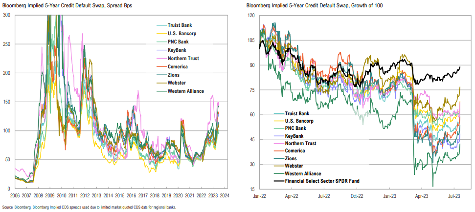 Market seem to be starting to give the all-clear on regional banks, but under-the-surface issues may still be lurking; the cost to insure against regional bank defaults remains elevated