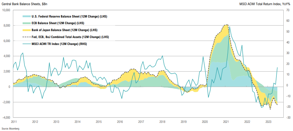 Fed, ECB and BoJ combined 12-month change in assets has been negative since June 2022; this has historically corresponded to poor global stock performance, making the current divergence unusual