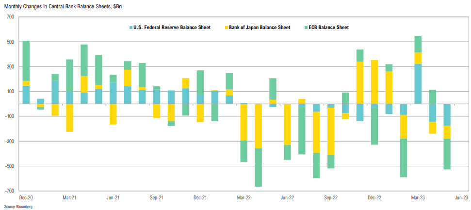 The Fed has done > $300bn of QT in the last 2 months; in US dollar terms, both the BoJ and ECB have seen balance sheet reduction, but this is due to currency movements rather than actual QT