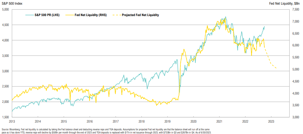 Fed net liquidity has had a tight correlation with stock market returns post-COVID; assuming the Fed continues with QT, liquidity should dry up throughout the rest of the year