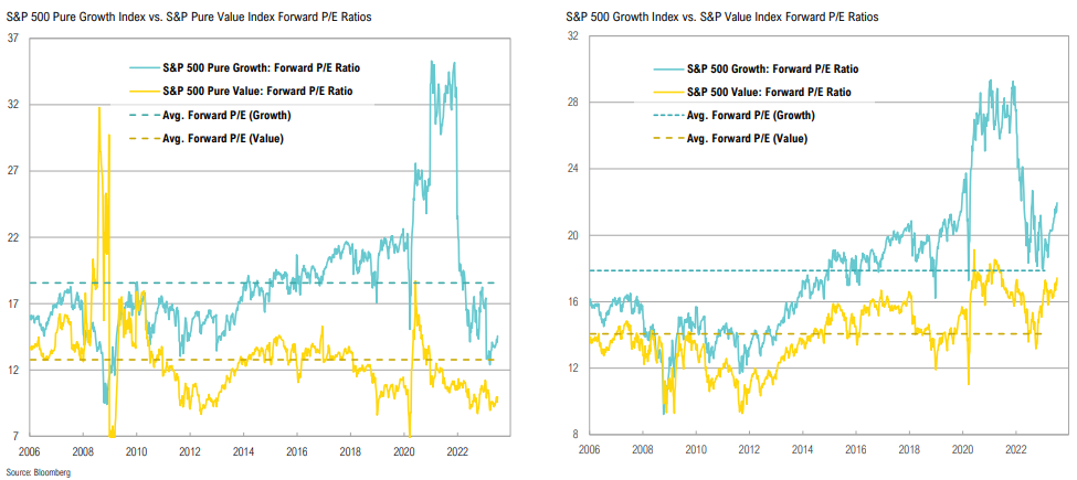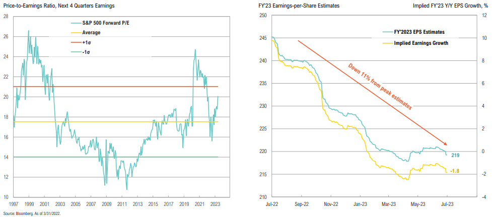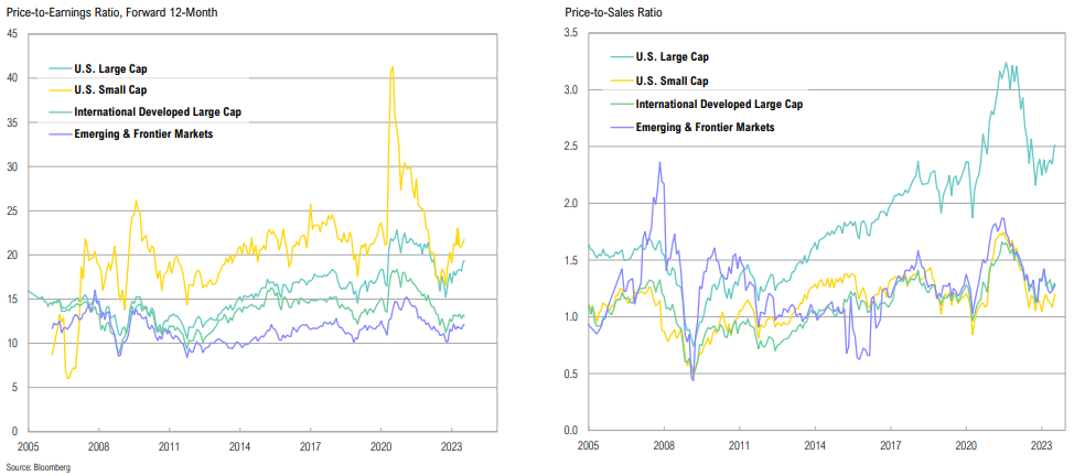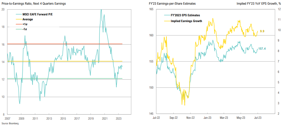 Developed international forward valuations also moved higher, and are now slightly below historical average; FY’23 earnings expectations indicate 10.0% YoY growth