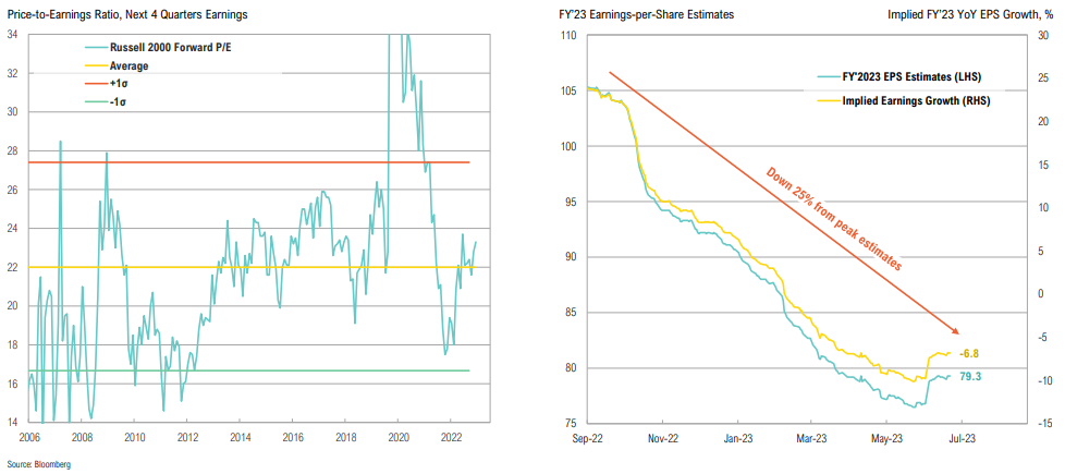 U.S. small cap forward valuations have moved higher, trading just above historical average; focus now shifts to FY’23 earning expectations, which have fallen 25% from 2022 peak