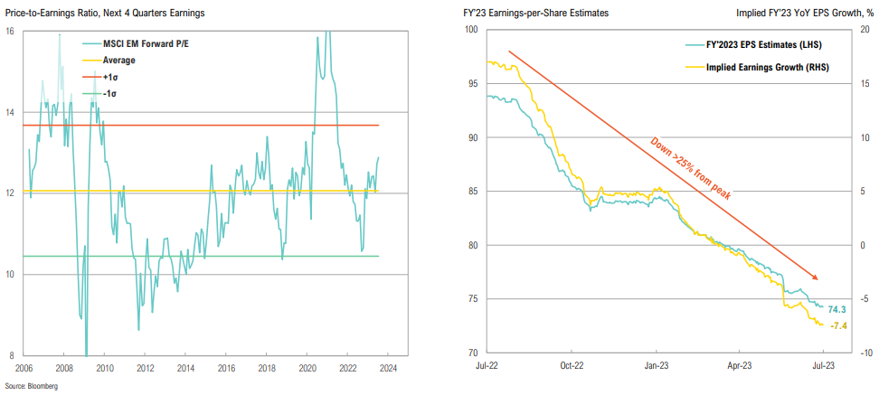 Emerging market forward valuations are well above their historical average; earnings expectations continue to trend lower, down > 25% from their peak