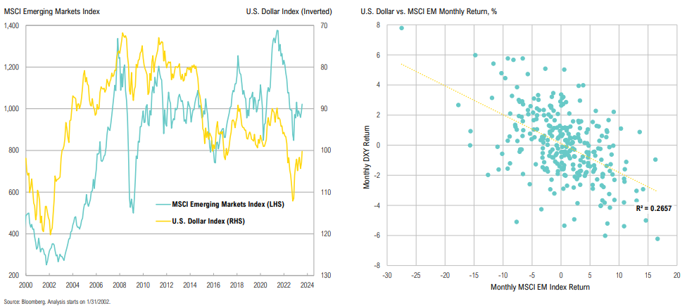 Dollar bulls probably want to be underweight EM and vice versa; in the absence of a strong opinion on the USD, we don’t have a strong opinion on EM