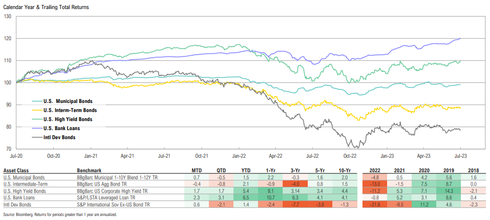 Q2 fixed income returns were a mixed bag: Both U.S. taxable and muni bonds declined while HY bonds and bank loans posted positive returns; international developed bonds performed worstTreasury Market