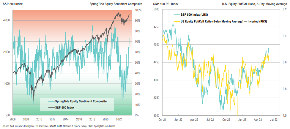 Overly bearish sentiment cleared over the quarter, making way for bullish sentiment; put/call ratio is showing increased bullishness at 0.55, rising to levels last seen in January