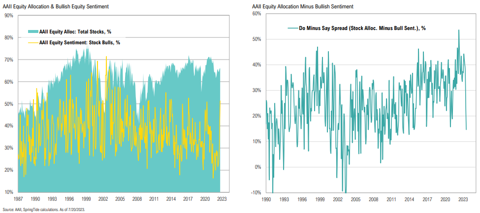 Bullish sentiment jumped up over the quarter, as did equity allocations; say-do spread dropped to more reasonable levels