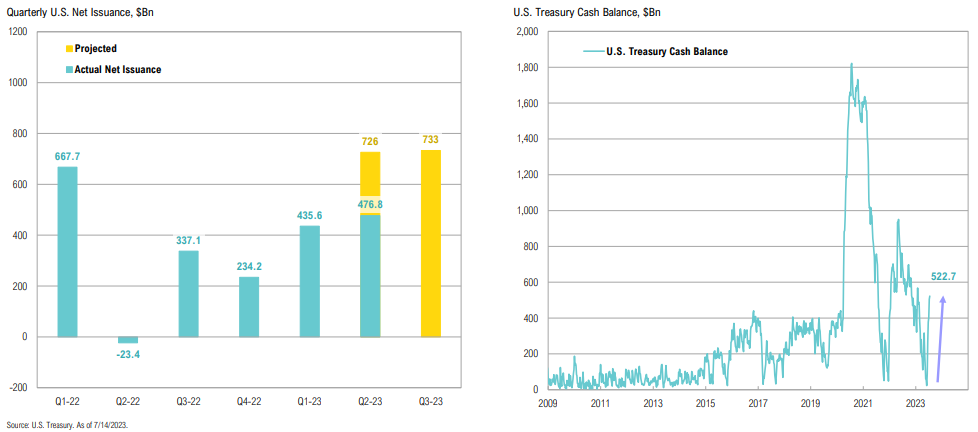 Q2 2023 net issuance was expected to be $726Bn, but fell short due to prolonged debt ceiling negotiations; Treasury is now playing ‘catchup’ with $550bn issued in June and a further $700Bn expected in Q3
